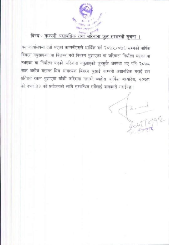 Rebate on fines by Company Registrar's Office Upto Ashoj 2078